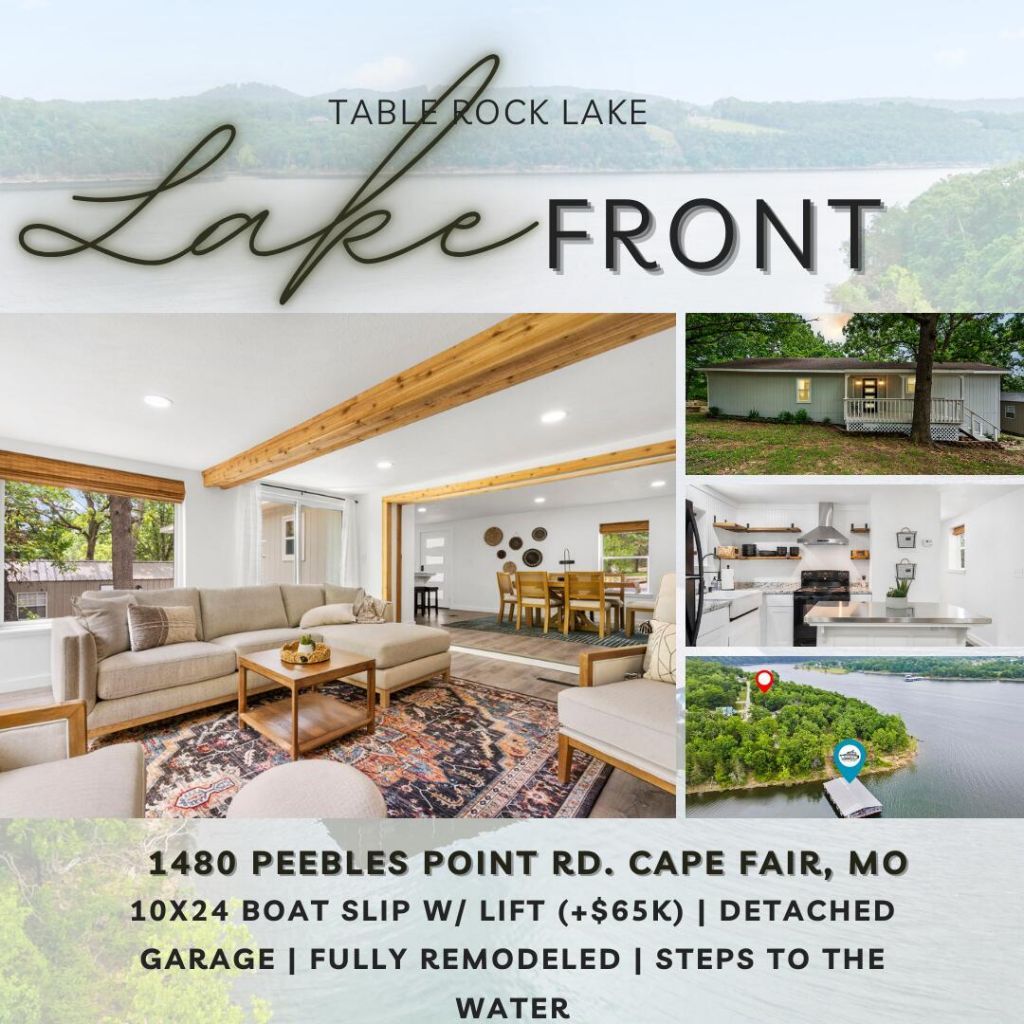 Welcome to 1480 Peebles Point Rd - A Front-Row Seat to Table Rock Lake!Prepare to be wowed by panoramic lake views the moment you step inside. This beautifully remodeled lakefront retreat has been completely updated over the past year, offering the perfect blend of modern style and lakeside comfort. It is only steps away from the water and the nearby dock.Nearly everything is brand new?including the flooring, drywall, lighting, interior and exterior paint, plumbing, electrical, cabinets, countertops, windows, water heater, and septic system?making this home truly move-in ready and a stress-free investment.Featuring 3 bedrooms, 1 spacious bathroom, a detached garage, and a separate mower shed, this property is packed with charm and functionality. Relax on the cozy covered front porch or take in the stunning views of crystal blue Table Rock Lake from the expansive back deck.Just a short walk from the home, you'll find your dock with a 10x24 boat slip and brand new electric lift?available for additional purchase.This home also has the option to be sold fully furnished. Just bring your boat and lake toys?your summer getaway is ready to go!