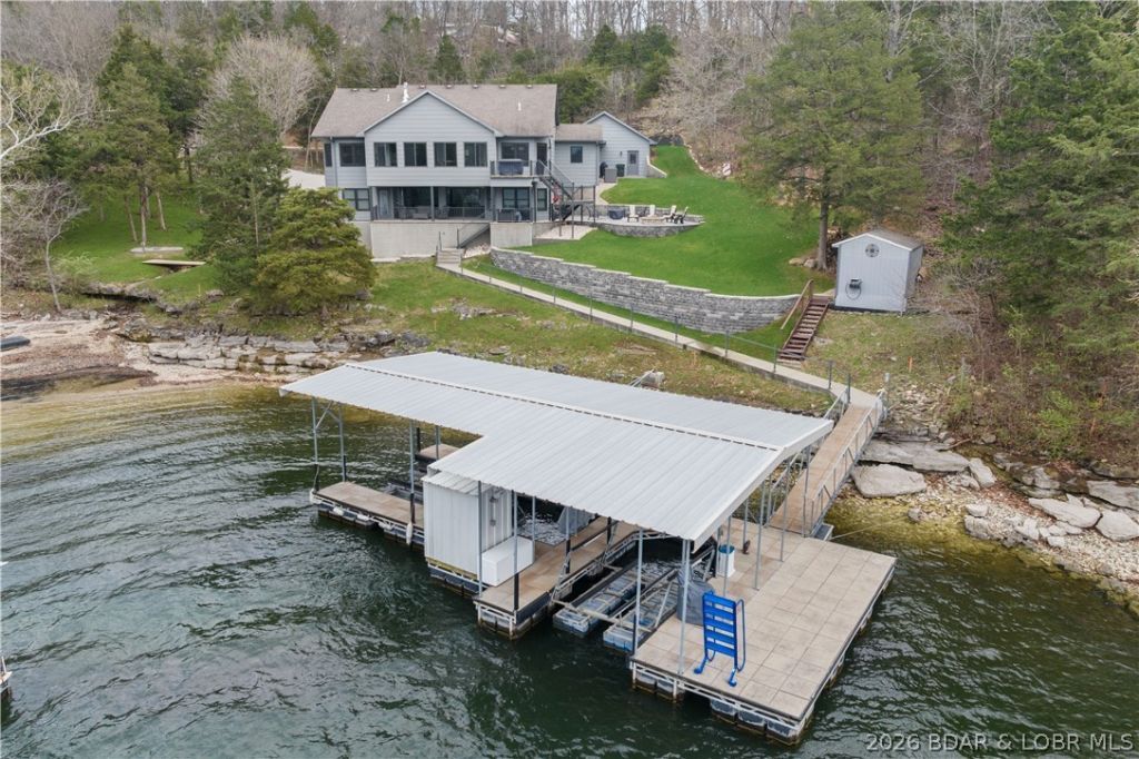Experience luxury lake living at its finest in this remarkable Signature Homes ranch walk-out, perfectly positioned at MM 4 of the Gravois Arm. Boasting 211 feet of pristine shoreline & unrivaled sunset views, this 4-bed, 3-bath retreat delivers ultimate privacy & sophisticated style in Rocky Mount. The heart of the home is a French Country chef's kitchen flowing into an open living space w/engineered hardwood & a whole-house speaker system. The luxurious primary suite features his-n-her closets & a spa-like ensuite. The lower level is an entertainer's dream, featuring a wet bar, a wine cellar with a custom handmade wood door, and a unique fireplace crafted from the stones of the property's original cabin. Step outside to a gentle, level walk to the large dock (featuring 11x30 and 10x20 slips, two hoists, and a swim platform) with layered rock shelving at the water's edge. Relax in the enclosed sunroom or by the massive fire pit area. The expansive concrete driveway parks 12+ vehicles and includes a 220V RV outlet. Located near favorites like Lake Burger, Jolly Rogers, Coconuts, and Maggies, every detail of this lakefront gem exudes quality. Your private, secluded sanctuary awaits!