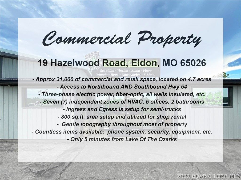 Excellent opportunity to own a 31,000 sq.ft. commercial property along Hwy 54 in Eldon with great highway visibility, only 5 minutes from The Lake. One of the best features for trucking / semi's is that it has Northbound and Southbound access to Hwy 54. The building has 7 zones of HVAC, insulated, 3-phase electric, located on 4.7 acres, 5 offices, 2 bathrooms, kitchenette, and more. Other features include: fiber-optic, all walls insulated, ingress and egress is setup for semi-trucks, 800 sq.ft. area setup and utilized for shop rental, gentle topography throughout most of property, and countless items are available: phone system, security, equipment, etc.