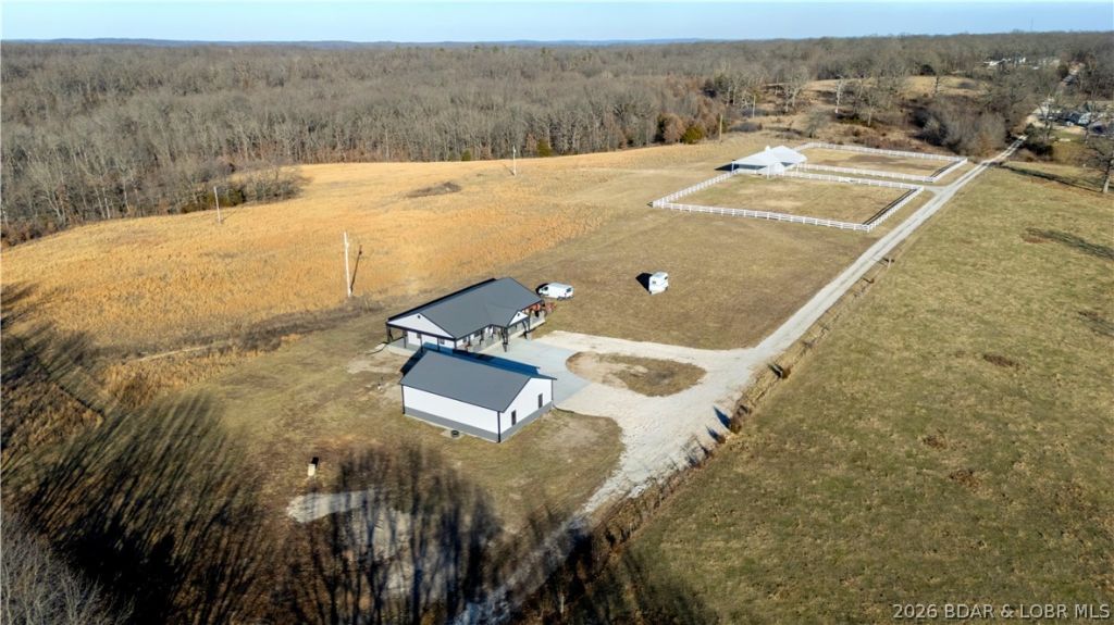 455 Camping Paradise Drive in Roach, MO offers a rare opportunity to own 21.2 acres of usable countryside near Lake of the Ozarks. Built in 2024, this one-level home features 2 bedrooms and 1.5 bathrooms with an open, comfortable layout designed for everyday living. The bright kitchen flows into the living and dining areas, complemented by a durable metal roof and efficient ductless mini-split heating and cooling. The property is set up for both function and flexibility. A detached 3-car garage/shop includes a roughed-in half bathroom, offering added convenience and future potential. The barn is configured with two separate fenced lots, ideal for animals, equipment, or hobby use. The acreage offers a mix of open and wooded ground with level areas and scenic views-perfect for recreation, privacy, or expansion. Private well and septic are in place, rentals are allowed, and the location provides easy access to Camdenton, Hwy 54, and all the amenities of Lake of the Ozarks.