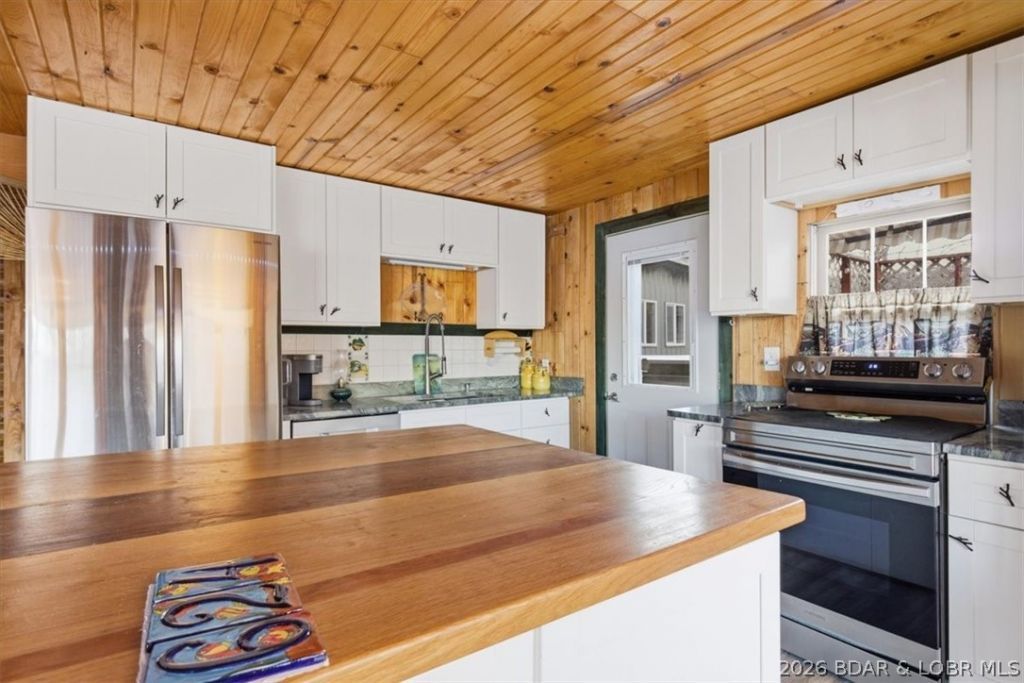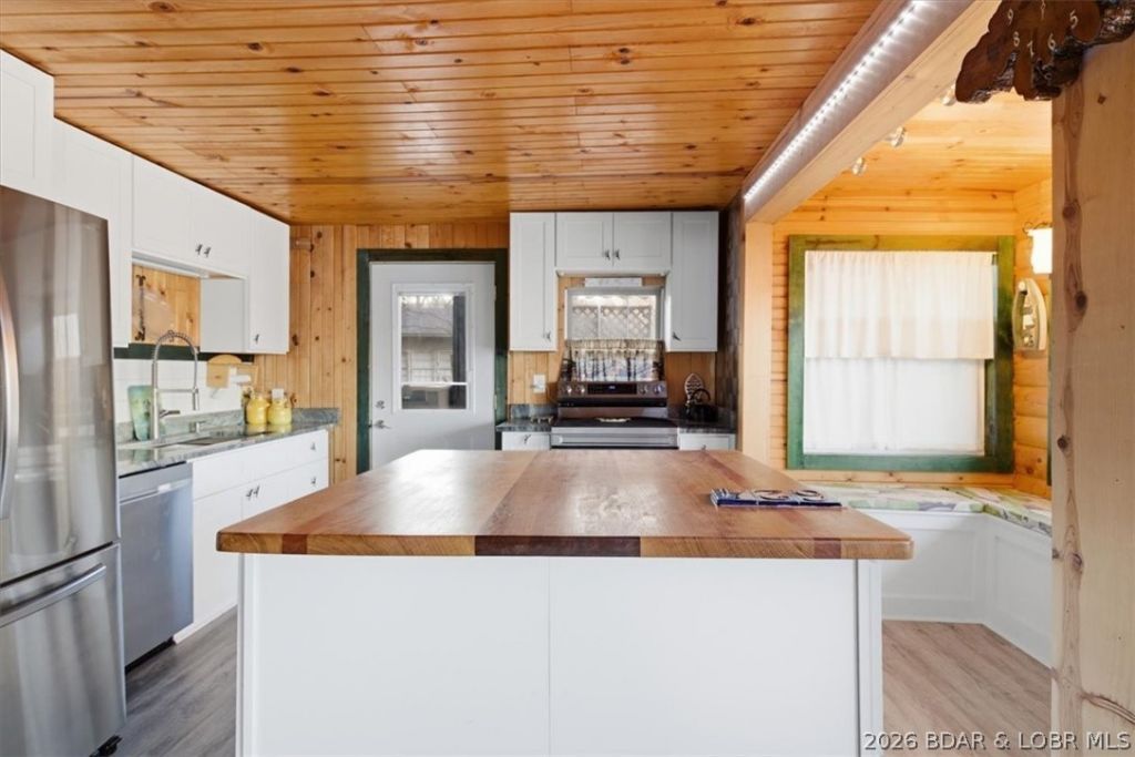 Lakefront living at its finest! Located in a peaceful private cove, this beautifully maintained cabin offers privacy, charm, and year-round enjoyment with stunning lake views. The functional layout features 1 bedroom, 1 bath, and a versatile bonus area that could easily serve as a 2nd bedroom. The master suite includes an electric fireplace, office space, and private balcony. A cozy dining nook overlooks the water, creating the perfect setting for morning coffee. The 2023 kitchen remodel highlights quartzite countertops, a large island with custom wood top, and new stainless steel appliances. Mini-split systems provide efficient heating and cooling throughout. Outdoor living is just as impressive with a spacious deck and roll-out canopy ideal for entertaining or relaxing at sunset. A tram and staircase provide easy access to the private 2-slip dock. An outdoor shower adds convenience after lake days. A 2024 detached metal building with dual entry and garage door offers excellent storage or workshop space. This move-in-ready lakefront retreat is ready to enjoy from day one and offers excellent potential as an income-producing property.